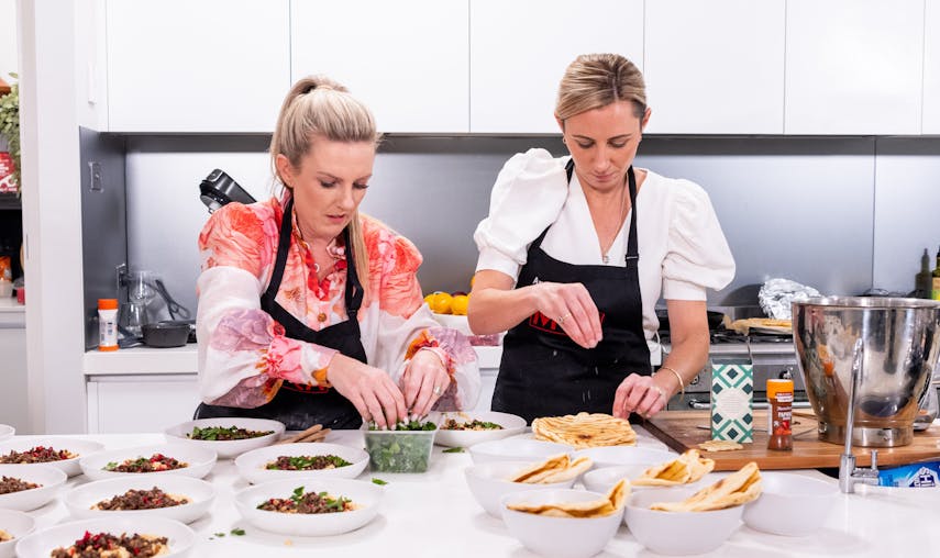For their entrée, the team chose Mel’s mother-in-law’s recipe of Spiced Lamb with Hummus, Pomegranate and Pita Bread. While cooking, Mel mentioned: “The lamb isn’t really the hero of this dish, but it is there to add that flavour and texture to it.”